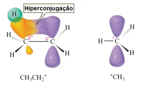 Existem dois efeitos eletrônicos que estabilizam os carbocátions, a hiperconjugação e o efeito de ressonância. A estabilidade referente à hiperconjugação é o resultado da sobreposição de um orbital p com um orbital molecular ligante vizinho, como as ligações C-H ou C-C.