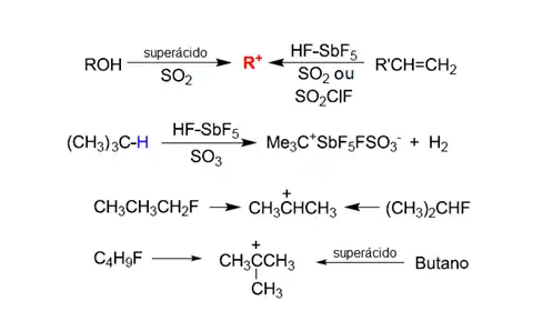 Carbocátions alquila simples: o cátion terc-butil é o mais estável de todos os cátions alquila, Figura 6. Ao reagir metano, etano e propano com meio reacional contendo superácido, também gera-se o cátion terc-butila como produto principal. Os fluoretos de propila geram o cátion isopropila. Os quatro fluoretos de butila geram o cátion terc-butila e o butano em meio superácido gera apenas o cátion terc-butila, Figura 7. Mesmo em meios reacionais superácidos, os carbocátions primários não apresentam estabilidade suficiente para serem detectados. Cátions do tipo alílico: Cátions alila e benzila são mais estáveis (efeito da ressonância) que a maioria dos outros carbocátions, uma vez que as moléculas que os formam são bastante reativas. Cátions alílicos estáveis podem ser obtidos pela reação entre halogenetos de alquila, alcoóis, ou alquenos (por extração de hidreto) e SbF5 em SO2 ou SO2ClF.