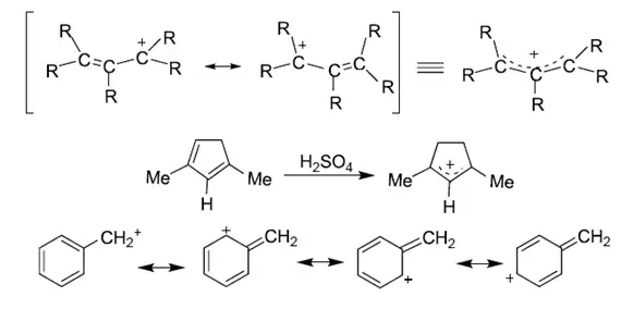 Os carbocátions alílicos e benzílicos são estabilizados pelo efeito de ressonância. Quanto mais substituído o carbono onde se localiza a carga positiva, mais estável o cátion (maior dispersão dos elétrons). É importante ressaltar que cátion vinila não é estável, pois a carga positiva está em um orbital sp, mais eletronegativo
