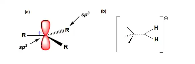 O termo carbocátion foi sugerido por George A. Olah para designar qualquer espécie catiônica do carbono.[1] Os carbocátions têm deficiência de elétrons, com apenas 6 elétrons na camada de valência e, por causa disto, são ácidos de Lewis. Eles reagem rapidamente com as bases de Lewis (são altamente reativos e instáveis), sendo denominados eletrófilos. Os dois principais tipos de carbocátions são os íons carbênio e os íons carbônio. Os carbênios são espécies positivas trivalentes, que possuem uma estrutura planar com hibridização sp2 no carbono catiônico e um sexteto eletrônico. Eles são normalmente formados como intermediários reacionais em reações de solvólise de halogenetos de alquila (SN1), desidratação de álcoois e protonação de ligações π dentre outras, podendo ser considerados como os principais intermediários em química orgânica.[2] Os íons carbônio são espécies positivas pentavalentes, classificadas como carbocátions não-clássicos, apresentando o octeto eletrônico completo no átomo de carbono e possuindo ao menos uma ligação três centros dois elétrons, onde três átomos compartilham um par de elétrons (Figura 1). George A. Olah, em estudos envolvendo parafinas verificou que em meios superácidos os alcanos agem como bases, compartilhando o par de elétrons de suas ligações com o próton ácido. Assim, metano pode ser protonado em uma mistura equimolar de HSO3F e SbF5, conhecida com o nome de ácido mágico, para formar o CH5+ (carbônio), que pode reagir com outras moléculas de metano no meio para gerar espécies maiores.[2] Assim, são exemplos de íons carbênio os cátions terc-butila e benzila. Dentre os íons carbônio podemos destacar o cátion 2-norbornila.