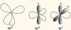 - Hibridação sp³: Ocorre em cristais de diamante onde as posições mais prováveis dos orbitais eletrônicos são localizadas no vértice de um tetraedro com um átomo de carbono no centro. Esse tipo de hibridização ocorre quando as quatro ligações covalentes são do tipo sigma (σ) e as ligações com os quatro vizinhos formam ângulos de 109º 28"