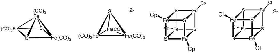 Muitos centros de Fe-S são conhecidos na área de química organometálica e como percursores de análogos sintéticos dos centros biológicos (ver figura).