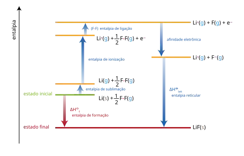 A soma das energias de cada passo do processo deve ser igual à entalpia de formação do metal e do ametal, .