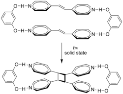 Efeitos supramoleculares podem influenciar estas cicloadições. A cicloadição de trans-1,2-bis(4-piridil)eteno é direcionada por resorcinol no estado sólido em rendimento de 100%.[4]