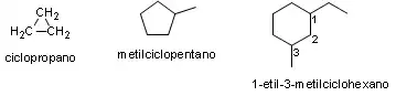 O nome dos cicloalcanos é derivado do alcano de cadeia aberta com o mesmo número de carbonos, incluindo o prefixo “ciclo”. No caso de cicloalcanos monosubstituídos, indica-se o radical ligado à estrutura, e para cicloalcanos com mais de um substituinte, numera-se de forma a ter o menor número para o conjunto dos substituintes, com prioridade seguindo a ordem alfabética. O nome dos cicloalcanos segue a regra: