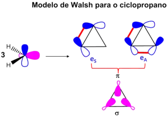 As olefinas e os derivados de ciclopropano estão relacionados em muitas maneiras[6]. A razão para isso reside na semelhança da ligação dupla C=C presente no anel de três membros. Existem duas descrições equivalentes para cada sistema. De acordo com o modelo de orbital molecular (MO) de Walsh5[7], três orbitais moleculares (MOs) ocupados determinam a natureza da ligação C-C do ciclopropano. Destes, a menor energia do orbital (σ) é uma combinação linear dos três orbitais atômicos (AOs) híbridos sp2, enquanto os outros dois (eS e eA), são combinações lineares de igual energia que os três p-AOs diferindo apenas em suas propriedades de simetria. Esta representação é fortemente reminiscente da descrição mais comum de uma ligação C=C por dois MOs ocupados, uma combinação linear de cada um dos dois AOs sp2 (σ-MO) e dois p-AOs (π-MO) (Veja Modelo de Walsh). Por analogia com os últimos MOs, os orbitais de Walsh eS e eA são também chamado π ou orbitais “quase-π” do anel de três membros.[7]