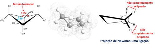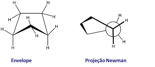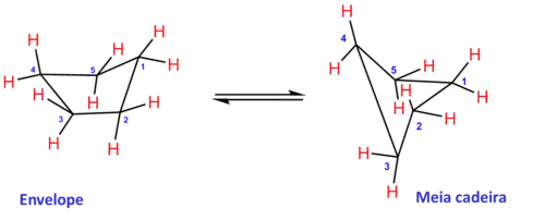 Existem duas conformações preferidas neste anel de cinco membros: a meia cadeira e a de envelope, nas quais também são evitados, dentro do possível, os eclipsamentos entre ligações C-H, que seriam observados se a molécula fosse plana (livre de tensão angular, porém com 10 kcal mol-1 de tensão torsional).