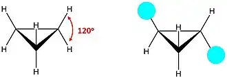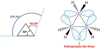Tensão angular no ciclopropano. Os ângulos de ligação são comprimidos até 60° a partir do ângulo de 109,28° da ligação normal de átomos de carbono sp3. Esta tensão angular leva a sobreposição não-linear dos orbitais e "ligações dobrados" conhecidos como ligação banana.[3]