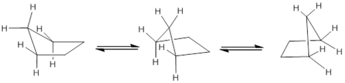 Na conformação de envelope, o metileno situado fora do plano tem suas ligações C-H alternadas com relação às ligações vizinhas. Como mostrado na Figura, esta estrutura do ciclopentano é dinâmica: mediante giros sucessivos das ligações C-C, se formam cinco confôrmeros distintos, em que quatro carbonos residem no plano, porém o quinto fica fora do plano. Este movimento sincronizado de cima para baixo dos cinco carbonos é denominado pseudorrotação, Veja Fuchs, Further Reading10[9]