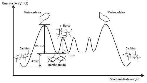 O estudo conformacional do cicloexano é mais complexo. A conformação mais estável do cicloexano é tridimensional, chamada de "conformação cadeira" e define as posições dos hidrogênios como axiais e equatoriais. Existe um equilíbrio com outras conformações chamadas de barco, barco-torcido e outra conformação cadeira. Um estudo mais detalhado está no tópico conformação do cicloexano.