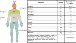 Considerando a composição química do corpo humano, é possível afirmar que mais de 99% de toda a massa de um ser humano padrão é composta por apenas seis elementos químicos distintos: oxigênio, carbono, hidrogênio, nitrogênio, cálcio e fósforo.[3][4] Considerando o 1% da massa restante, é possível afirmar que 0,85% correspondem a outros cinco elementos somados: potássio, enxofre, sódio, cloro e magnésio.[4] Todos os demais elementos somados juntos não alcançam a massa do magnésio, o menos abundante dos 11 elementos citados nesta lista.[5]