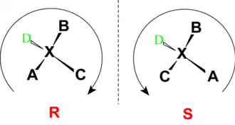 - ↑ IUPAC, Compêndio de Terminologia Química, 2ª ed. ("Gold Book"). Compilado por A. D. McNaught e A. Wilkinson. Blackwell Scientific Publications, Oxford (1997). Versão online: "Absolute configuration" (2006–) criado por M. Nic, J. Jirat, B. Kosata; atualizações compiladas por A. Jenkins. ISBN 0-9678550-9-8.