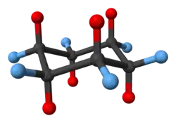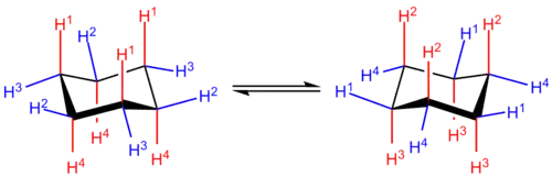 Na conformação de cadeira de mínima energia, 6 dos 12 hidrogênios estão em posições axiais (coloridas de vermelho)—suas ligações C-H são paralelas umas com as outras e parecem dispor-se acima e abaixo da estrutura do anel, os outros 6 estão em posições equatoriais (coloridas de azul)-estão dispostos ao redor do perímetro do anel. Note-se que, além disso, um hidrogênio em cada posição está "acima" em relação ao outro que está "abaixo" nessa posição.