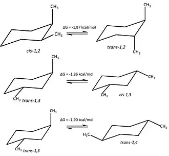 O diastereômero mais estável em cada caso é aquele em que ambas os grupos metílas são equatoriais. O ΔG é semelhante para cada um dos isómeros diequatorial (1,9 kcal/mol) e é muito perto do valor de ΔG conformacional do metilciclohexano (1,8 kcal/mol). Isto implica que não há interações importantes adicionais no dimetilciclohexano em comparação com o metilciclohexano. Isto é razoável, porque em cada caso, o grupo metil axial interage apenas com os hidrogênios 3,5-diaxal6.