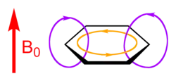 Uma corrente de anel aromático é um efeito observado em moléculas aromáticas como benzeno e naftaleno. Se um campo magnético é diretamente perpendicular ao plano do sistema aromático, uma corrente de anel é induzida nos elétrons π deslocalizados do anel aromático. Esta é uma consequência direta da lei de Ampère; já que os elétrons envolvidos são livres para circular, em vez de estarem localizadas em ligações como eles estariam na maioria das moléculas não aromáticas, eles respondem muito mais fortemente com o campo magnético.[1]