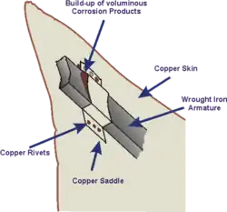 Um exemplo espectacular de corrosão galvânica, ocorreu na Estátua da Liberdade quando os trabalhos regulares de manutenção periódica, nos anos 80 do século XX, revelaram a existência de corrosão, entre as chapas do revestimento exterior de cobre e a estrutura de suporte interior de ferro forjado. Apesar de o problema ter sido antecipado em 1880. quando a estrutura foi construída por Gustave Eiffel seguindo o projecto de to Frédéric Bartholdi, a camada de isolamento de Goma-laca entre os dois metais, desapareceu com o passar dos anos, resultando na corrosão dos apoios em ferro forjado. Apesar de a sua intergidade estrutural não estar em causa, devido a ser um dos símbolos dos Estados Unidos, a estátua sofreu um extenso programa de restauro que passou pela sua desmontagem integral, e substituição do isolamento original por placas de Teflon. .[2][3]