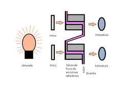 A configuração de um detector de UV-vis de comprimento de onda fixo pode ser representada pela seguinte figura 1: