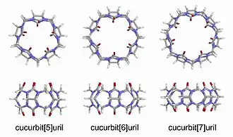 Cucurbituriloss são moléculas macrocíclicas feitas de monômeros de glicoluril (= C4H2N4O2 =) ligados por pontes de metileno (-CH2-). Os átomos de oxigênio estão localizados ao longo das bordas da banda e são inclinados para dentro, formando uma cavidade parcialmente fechada.[1] O nome deriva da semelhança dessa molécula com uma abóbora da família das Cucurbitaceae.