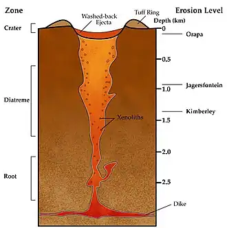 A evidência geológica apoia um modelo no qual o magma de kimberlito sobe a 4–20 metros por segundo, criando um caminho ascendente por fraturação hidráulica da rocha. À medida que a pressão diminui, uma fase de vapor exsolve-se do magma, e isto ajuda a manter o magma fluido. À superfície, a erupção inicial explode através de fissuras a altas velocidades (superior a 200 m/s (450 mph)). Depois, a pressões mais baixas, a rocha é erodida, formando uma chaminé e produzindo rocha fragmentada (brecha). À medida que a erupção diminui, há uma fase piroclástica e, em seguida, o metamorfismo e a hidratação produzem serpentinitos.[16]