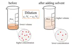 Diluição é o processo físico-químico de tornar uma solução menos concentrada em partículas de soluto através do aumento do solvente (número de vezes que a concentração da solução vai diminuir).
