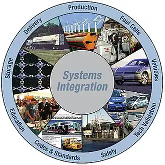 A economia do hidrogênio é uma proposta de economia futura baseada no uso do hidrogênio como fonte de energia.[2] Diversas aplicações são identificadas para este armazenador de energia (já que o H2 não constitui fonte quaternária), tais como o seu uso em veículos e naves espaciais.