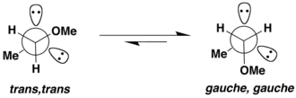 A hiperconjugação também é encontrada em moléculas acíclicas contendo heteroátomos, outra forma do efeito anomérico. Se uma molécula tem um átomo com um par solitário de elétrons e o átomo adjacente é capaz de aceitar elétrons no orbital σ *, ocorre hiperconjugação, estabilizando a molécula. Isso forma uma ressonância "sem vínculo". Para que essa sobreposição orbital ocorra, a conformação trans, trans é preferida para a maioria dos heteroátomos; no entanto, para que a estabilização ocorra no dimetoximetano, a conformação gauche, gauche é cerca de 3 a 5 kcal / mol mais baixa em energia (mais estável) do que a trans , conformação trans - é cerca de duas vezes maior que o efeito nos açúcares porque existem duas ligações rotativas (portanto, é trans em torno de ambas as ligações ou gauche em torno de ambas) que são afetadas.[7]