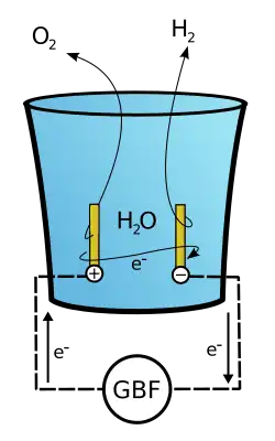 A Eletrólise da água é a decomposição química da água (H2O) em oxigênio (O2) e hidrogênio (H2) por efeito da passagem de uma corrente eléctrica pela água (ver: Separação da água). No entanto, este processo eletrolítico raramente é usado em aplicações industriais uma vez que o hidrogênio pode ser produzido mais acessivelmente através de combustíveis fósseis. Uma fonte de energia eléctrica está ligada a dois eléctrodos (geralmente feitos a partir de alguns metais inertes como a platina ou o aço inoxidável, no caso da imagem 1, é usada a grafite) que estão colocados na água. Se tudo estiver corretamente montado, origina-se hidrogênio no cátodo (o eléctrodo ligado ao terminal negativo da fonte de energia) e oxigênio no ânodo (o eléctrodo ligado ao terminal positivo da fonte de energia).[1]