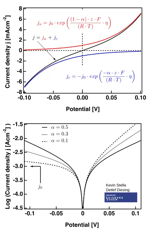 Tratando o sistema acima para e em termos das concentrações de equilíbrio e e da densidade de corrente de troca , a densidade de corrente como uma função do potencial aplicado pode ser escrita:[5]