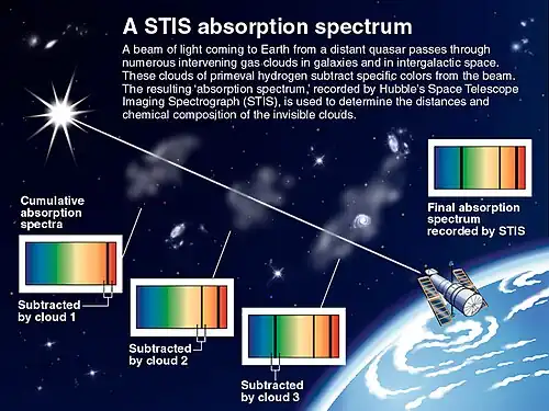 O espectro de absorção de um material é a fração da radiação incidente absorvida pelo material em uma faixa de frequências da radiação eletromagnética. O espectro de absorção é determinado principalmente[2][3][4] pela composição atômica e molecular do material. É mais provável que a radiação seja absorvida em frequências que correspondem à diferença de energia entre dois estados da mecânica quântica das moléculas. A absorção que ocorre devido a uma transição entre dois estados é chamada de linha de absorção e um espectro é normalmente composto de muitas linhas.