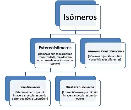 Moléculas que possuam a mesma fórmula molecular, porém com os seus átomos em distintos arranjos espaciais são chamadas isômeros. Pode falar-se em isomerismo constitucional (ou estrutural) e isomerismo espacial (que levará ao caso dos estereoisômeros).
