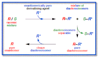Para misturas racêmicas é possível isolar um enantiômero específico através de um agente de quiral de derivatização, como mostra a figura abaixo:[22]