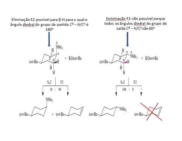 Os compostos (4-terc-butilciclohexil) trimetil-amonio iodeto e terc-butoxi de potássio (KOtBu) podem submeter-se tanto a reações E2 quanto a reação Sn2. No entanto a reatividade e a quimioseletividade variam consideravelmente em função da configuração cis ou trans do substrato derivado de ciclohexano. O isômero cis reage tanto por E2 quanto por Sn2 dando uma mistura de 90:10 em uma reação rápida. Já o isomêro trans reage muito mais lentamente dando somente o produto de substituição. De acordo com a equação da figura abaixo, essas descobertas significam que KE2, cis : KSn2, cis = 90:10 e KE2,trans : KSn2, trans < 1:99. Uma hipótese plausível é que para a respectivas reações de substituição KSn2, cis ~ KSn2, trans. Isto por sua vez, significa que a quimioseletividade oposta de duas reações na figura abaixo surgem quase exclusivamente do fato KE2,cis >> KE2, trans.