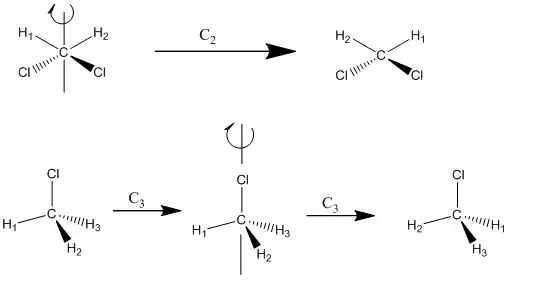 A existência de um eixo de rotação Cn (n eixos de rotação) em uma molécula implica que se esta gira com uma rotação de 360°/n ao redor deste eixo de modo que o arranjo dos átomos da molécula não será alterado, ou seja, o arranjo não será distinguido do original. Por exemplo, pode-se girar o cis-dicloroeteno a 180º por um eixo perpendicular ao plano da ligação dupla que passa através do ponto médio do mesmo e a molécula permanecerá inalterada.