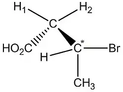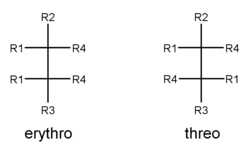As moléculas podem ter vários centros estereogênicos, como por exemplo, para o (2R,3R)-2-3-dibromobutano. Para determinar a configuração absoluta, considera-se cada centro separadamente e cada centro é especificada como R e S. O grupamento contendo o segundo centro estereogênico é considerado como um substituinte[6].