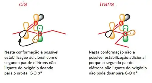 Na forma Z, existe a possibilidade de outro efeito secundário porque nessa forma o oxigênio do éter tem um par de elétrons o qual está orientado antiperiplanar a ligação σ C – O do grupo carbonil, conforme figura abaixo. Este par de elétron pode overlap com o orbital antiligante σ* da ligação.