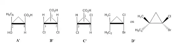 O ácido 2,2-dimetilciclopropanocarboxílico (A) tem um centro quiral em C(1) e existe como um par de enantiômeros e seu estereoisomerismo não se difere de moléculas quirais acíclicas. O mesmo ocorre no ácido ciclopropano-1,2-dicarboxílico que tem três estereoisômeros: uma forma meso (B) e um par de enantiômeros (C, D) diastereoméricos com a forma meso [8].