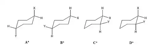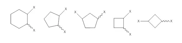 Assim como em uma dupla ligação onde os substituintes podem estar no mesmo lado ou opostos, em um composto cíclico isto também pode ocorrer. Os arranjos são de configurações diferentes e, portanto não podem ser modificadas a menos que haja quebra ou formação de pelo menos uma ligação.[6]