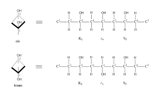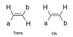 Quando há apenas dois substituintes diferentes, utiliza-se a notação cis e trans. O isômero com ambos os substituintes no mesmo lado são chamados de cis, enquanto que o isômero com substituintes opostos são denominados trans.[6]