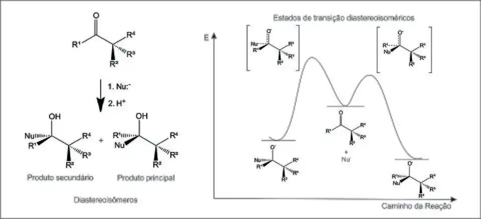 Por outro lado, o grupo carbonila pode estar inserido em um ambiente quiral, devido à presença de centros assimétricos em outros sítios da molécula. Nesse caso, suas faces são diastereotópicas, ou seja, a reação de adição de um nucleófilo aquiral gera uma mistura de diastereoisômeros, e tanto os estados de transição quanto os produtos são diasteroisoméricos. A não ser por coincidência, os diastereoisômeros são obtidos em quantidades diferentes, tanto em condições cinéticas quanto termodinâmicas (ver esquema abaixo).[18]
