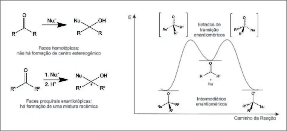 Exceto pelo formaldeído, as faces do grupo carbonila em aldeídos são proquirais. Nas cetonas, a proquiralidade acontece quando os dois substituintes ligados ao carbono carbonílico são diferentes. Se essas condições forem satisfeitas e não houver quiralidade presente nos substituintes R¹ e R², o grupo carbonila é enantiotópico, ou seja, numa reação de adição de um nucleófilo aquiral, uma mistura equimolar de enantiômeros se forma desde que a espécie nucleofílica seja diferente dos substituintes já ligados ao carbono carbonílico (ver esquema abaixo).[18]