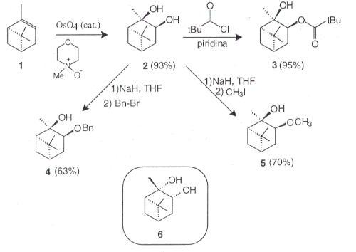 No exemplo acima, o substrato quiral (-)-α-pineno é convertido para (+)-pinenodiol através da hidroxilação da ligação pi pela face menos impedida estericamente, consequentemente, menor energia de ativação para sua formação. A partir do (-)-α-pineno novos produtos são formados ao reagir com a hidroxila menos impedida.[21]