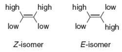 Quando a prioridade for atribuída, o isômero que apresentar as maiores prioridades no mesmo lado é chamado isômero Z. Se os grupos com maiores prioridades estiverem em lados opostos, o isômero é denominado E. As letras são de origem alemã, E representa a palavra entgegen, que significa “opostos” e Z refere-se a zusammen, que quer dizer “juntos”.[4]