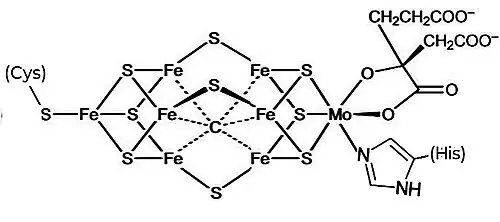 3. Os dois clusters são ligados por três ligantes de sulfeto (chamados de “enxofres equatoriais”) e um átomo de carbono intersticial central hexacoordenado, o qual está ligado a seis ferros por ligações 3c-2e (essas ligações diretas Fe–C tornam esse cofator um composto organometálico). A subunidade contendo exclusivanente átomos de ferro é ancorada à proteína por uma ligação com o grupo lateral sulfeto de um aminoácido cisteína. Ele também é ligado a três sulfetos, resultando em geometria molecular tetraédrica. Os seis centros de Fe adicionais no cluster são cada um ligado a três sulfetos e ao carboneto central. Esses seis centros Fe internos definem um arranjo prismático trigonal em torno do centro de carboneto. Os estados de oxidação dos átomos de ferro são em parte +2 e em parte +3. O molibdênio é ligado a três sulfetos e é ancorado à proteína pelo grupo imidazol de um resíduo de histidina. Também ligado ao Mo está um cofator homocitrato bidentado, levando à geometria octaédrica.[2] Seu estado de oxidação foi definido recentemente como +3.[3] A análise cristalográfica da proteína MoFe revelou inicialmente a geometria e a composição química do FeMoco,[4][5][6] posteriormente confirmada por estudos de estrutura fina de absorção de raios X estendida (EXAFS).[7] As distâncias Fe-S, Fe-Fe e Fe-Mo foram determinadas como 2,32, 2,64 e 2,73 Å, respectivamente.[7]