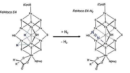 O gás nitrogênio liga-se ao cofator quando este está no estado E4, reduzido por 4 elétrons. Ao ligar-se ao cluster, o nitrogênio molecular desloca os dois hidretos (que são oxidados a gás hidrogênio),[24] com consequente redução do ferro +2 ao qual estavam ligados a um ferro no estado de oxidação 0 altamente redutor, que se liga ao N