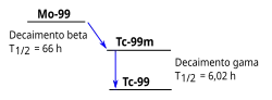 No gerador, o Mo-99 (que possui uma meia vida de 65,94 h), decai para o Tc-99m (com meia vida de 6,02 h). Como a meia-vida do Tc-99m é muito mais curta, os dois radioisótopos atingem o equilíbrio secular e assim a taxa de produção do Tc-99m é aproximadamente constante.[1]