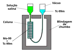 O gerador é composto por uma coluna cromatográfica empacotada com alumina (Al2O3) onde encontra-se adsorvido, por afinidade eletrônica, o Mo-99, na forma de molibdato (99MoO4). Quando o Mo-99 decai para Tc-99m, forma-se o composto pertecnetato (99mTcO4). O pertecnato tem baixa afinidade pela alumina e é posteriormente extraído na forma química de pertecnetato de sódio (NaTcO4), a partir da injeção de uma solução salina (NaCl 0,9%) no gerador. A coluna é fechada em ambas as extremidades e possui duas agulhas que permitem a entrada e saída do eluente (NaCl). O frasco do eluente é então conectado à agulha de entrada e o frasco coletor (estéril) que está, inicialmente, em vácuo é conectado à agulha de saída. Dessa forma, a diferença de pressão, empurra o eluente pela coluna de alumina, sendo, posteriormente, recolhido no frasco coletor. O gerador é blindado com chumbo para evitar exposições acidentais e proteger o operador.[2][3][6]
