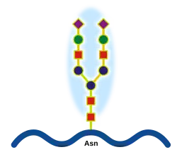 A glicosilação de proteínas N-ligadas (N-glicosilação de N-glicanos) nos resíduos Asn (motivos Asn-X-Ser/Thr) em glicoproteínas.[1]