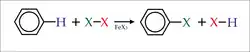 A reação não ocorre sem a presença de um ácido de Lewis que é o responsável por liberar no meio reacional o eletrófilo, no caso, um cátion do halogênio. Os ácidos mais comuns são FeBr3 e FeCl3 (SOLOMONS e FRYHLE, 2001).