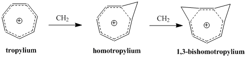 Teoricamente, se podem obter famílias de compostos homoaromáticos a partir de sistemas cíclicos e conjugados com (4n +2) π elétrons, introduzindo unidades de CH2 dentro do anel. Talvez o exemplo mais conhecido deste tipo de espécies sejam os derivados do íon aromático tropílio. Na figura 1, se apresentam algumas das estruturas que conceitualmente podem ser derivadas deste cátion.[13]
