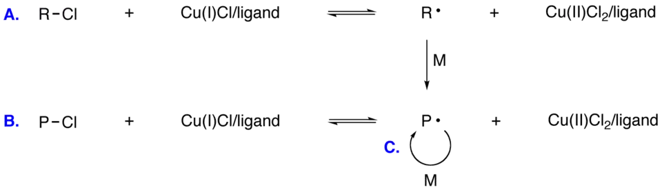 - Em polimerização radical por transferência de átomos (ATRP, atom transfer radical polymerization) haletos de carbono geram reversivelmente radicais orgânicos na presença de catalisador de metal de transição.